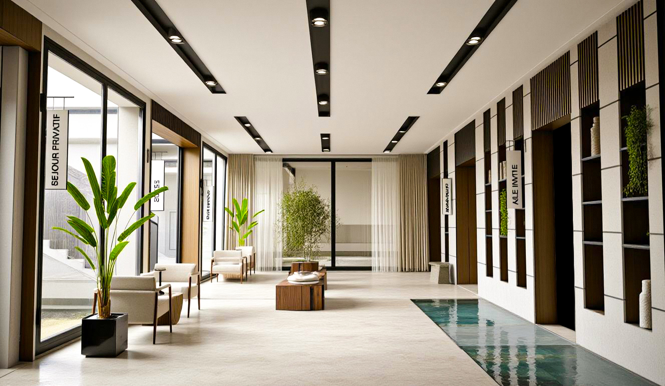 Natural light, water, and vegetation shape a calm and refined atmosphere, while open views toward the lagoon and the pool enhance the sense of serenity. Clean volumes and a restrained material palette—combining mineral textures and warm wooden surfaces—create timeless, soothing interiors.